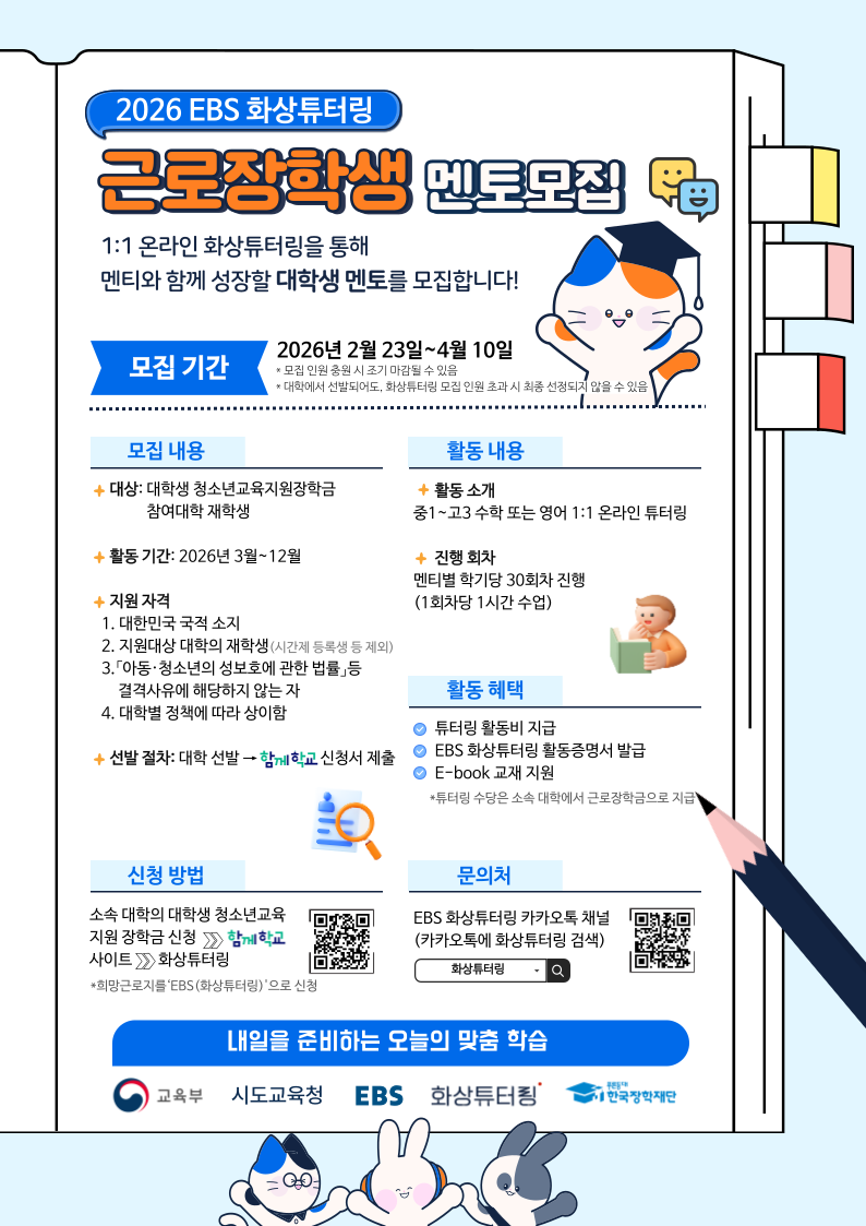 2026년 대학생 청소년교육지원장학금 및 [EBS 화상 튜터링 사업] 간 협업을 위한 멘토 모집 안내